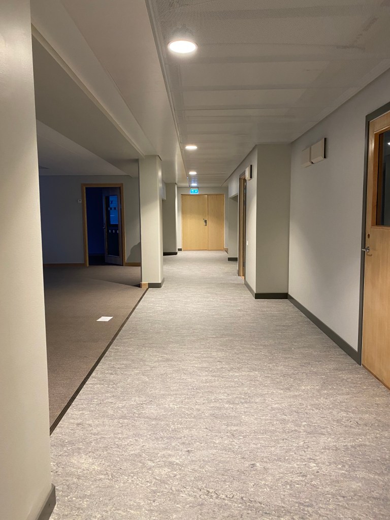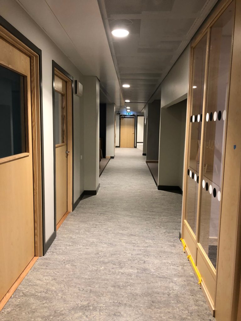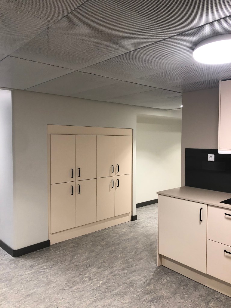 Vi fick i uppdrag att verksamhetsanpassa gamla lokaler i Ungdomens Hus i Älvsjö Medborgarhus för att rymma Äldreförvaltningens nya kontor. Målet var att skapa flexibla och tillgängliga arbetsplatser för 130 personer, där vissa rum med högre säkerhetskrav utformades som fasta kontor medan övriga utrymmen blev flexibla och anpassade för olika behov som mötesrum, arbetsplatser och samtalsrum. Förvaringsplatser delades mellan två våningsplan. En utmaning i projektet var att hantera den begränsade takhöjden enligt BBR-kraven. Vi löste detta genom att samordna med VVS E för att lägga de på samma höjd utan att sänka taket. Perforerade undertak ger en rymligare upplevelse i rummen. Inbyggda skåp och förvaring integrerades med nischer som skapade raka linjer längst kommunikationsplatser.